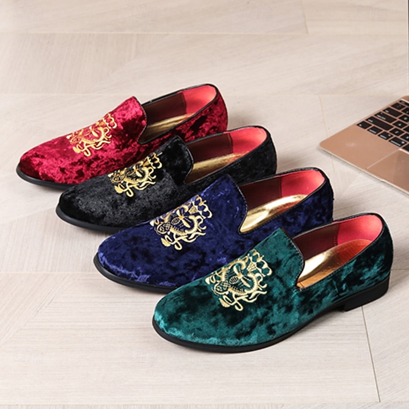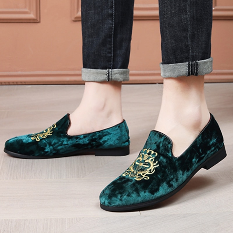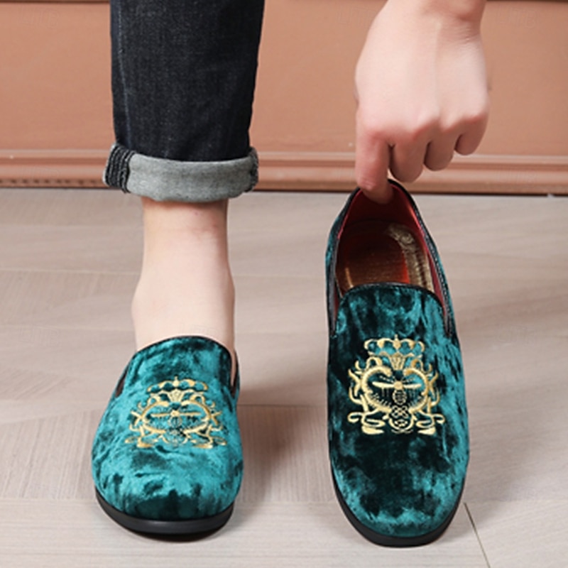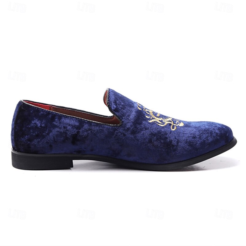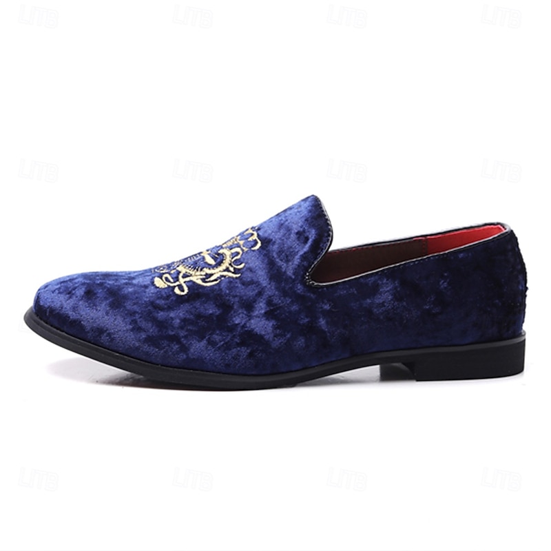 Men's Navy Blue Velvet Loafers with Gold Embroidery - Elegant Slip-On Shoes for Formal Events & Parties
