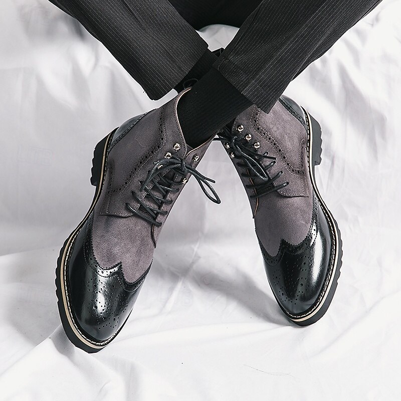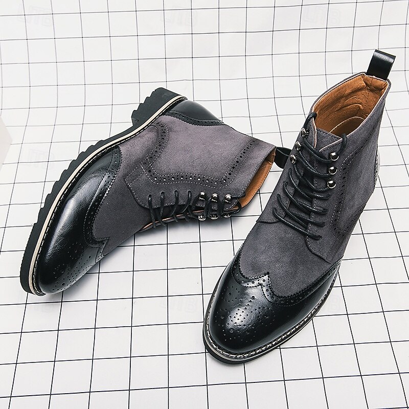Highlights [Fabric] : Crafted from premium PU leather and suede, these men's ankle boots offer a soft texture and a sophisticated finish. The blend of materials ensures both durability and an upscale look, suitable for any fashion-forward wardrobe. [Fit] : Designed with a round toe and ankle-high silhouette, these boots provide a comfortable fit while offering additional coverage. The secure lace-up closure allows for a customizable fit and added support, accommodating extended wear with ease. [Design Highlights] : Featuring vintage brogue detailing with wingtip design, these boots combine vintage charm with a new-age twist. The darker leather accents against the rich brown suede enhance the overall elegance, while the rugged rubber sole offers excellent grip and stability. [Occasions] : Perfect for both casual and formal settings, these boots are ideal for anyone who appreciates timeless fashion. Whether at weekend gatherings or professional meetings, their versatile style makes them suitable for various occasions. [Size Notice] : Available in sizes ranging from US6 to US10.5, these boots ensure a comfortable fit for a broad spectrum of foot sizes, catering to the needs of those who seek both style and practicality.