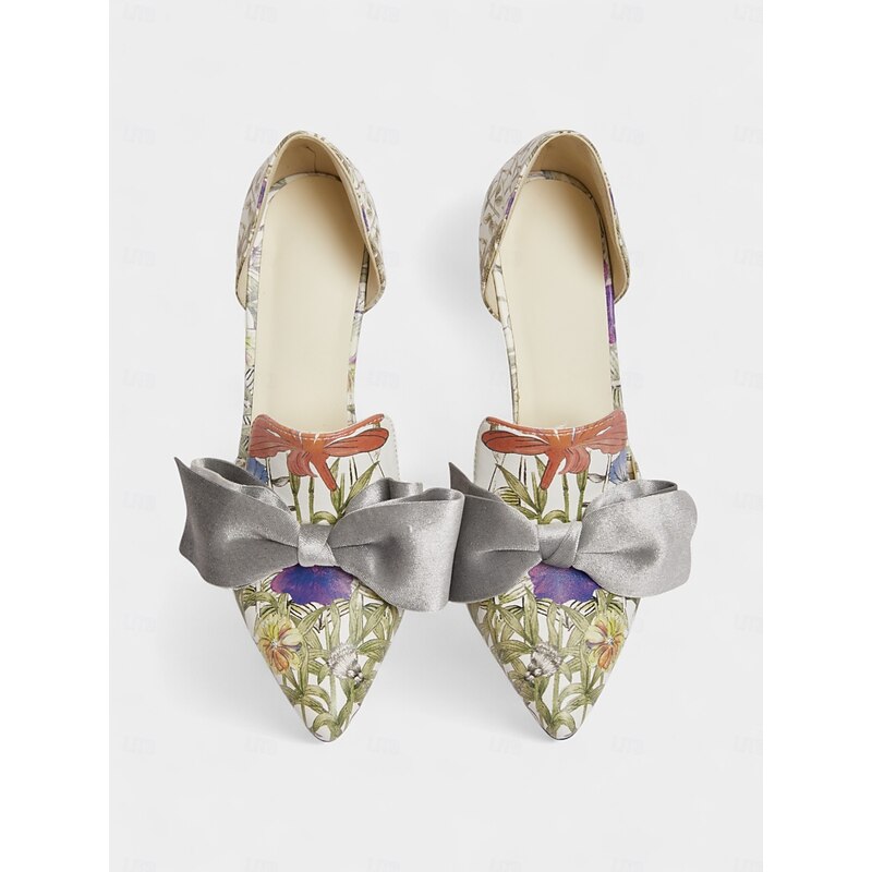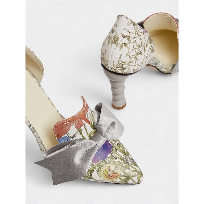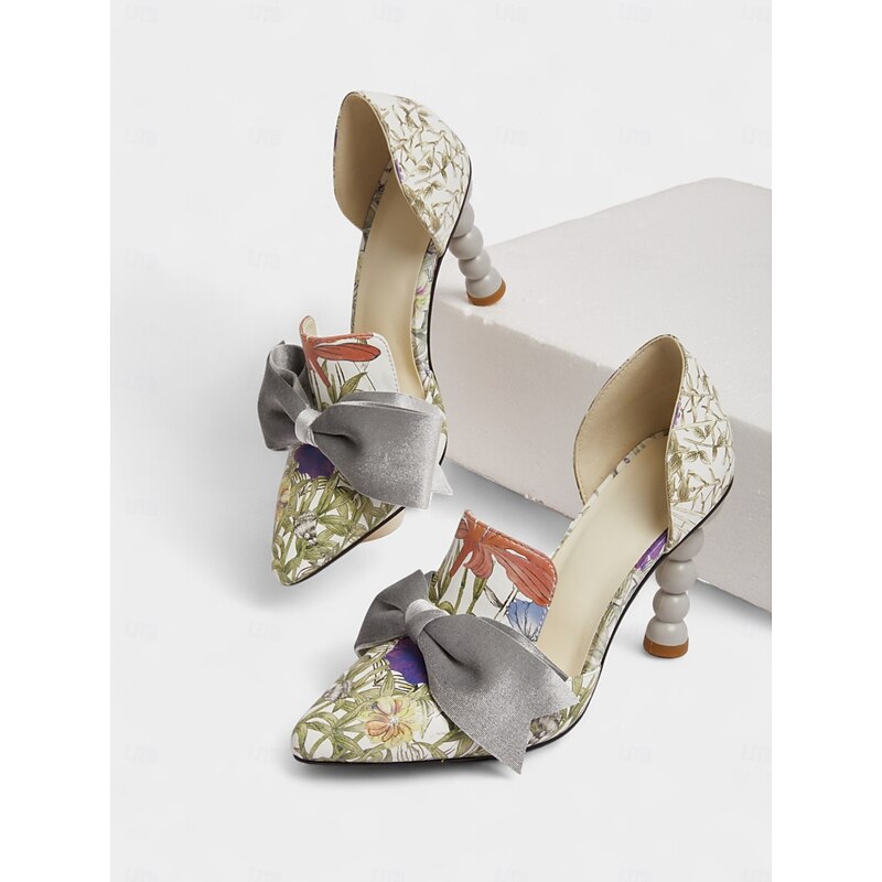 sizzling ! Women's Baroque Floral Pointed Toe Heels with Pearl Beaded Heel and Satin Bow – 1950s Elegant Vintage Dress Shoes for Weddings, Parties and Formal Events