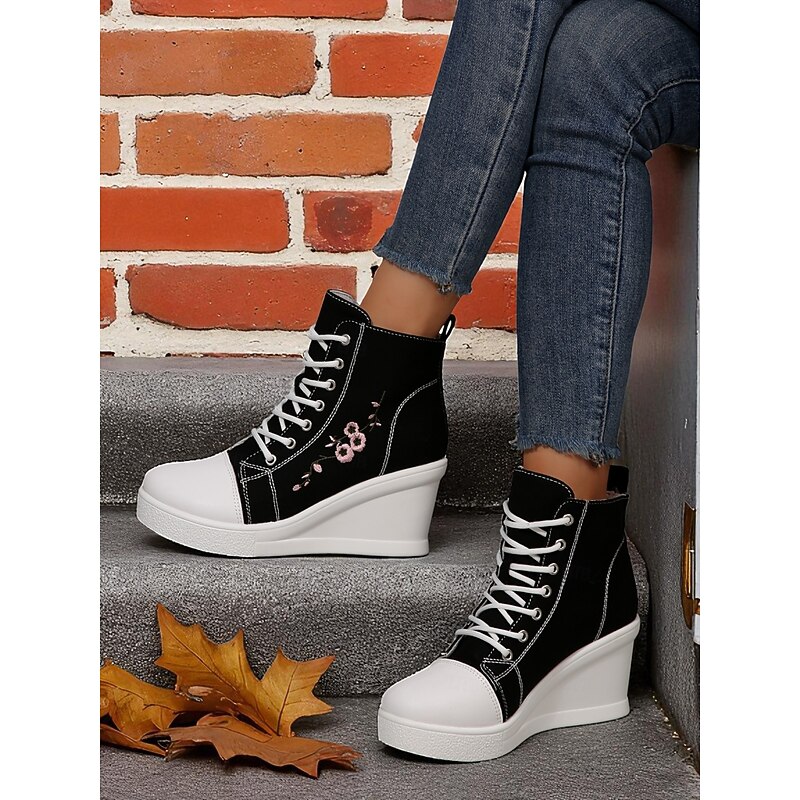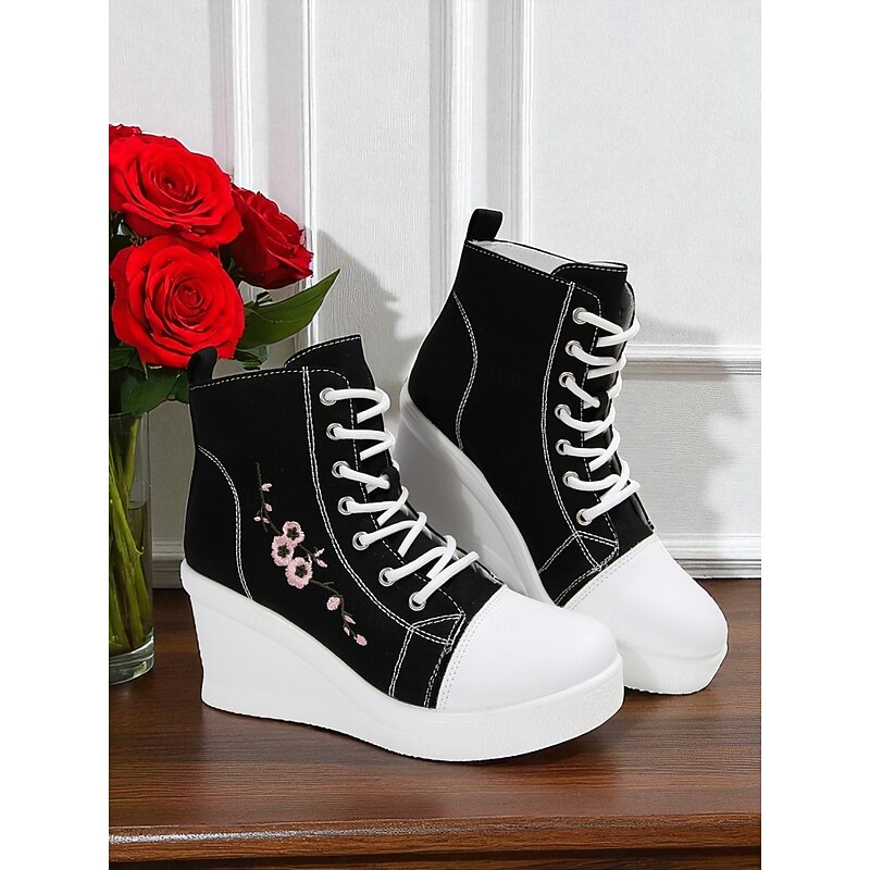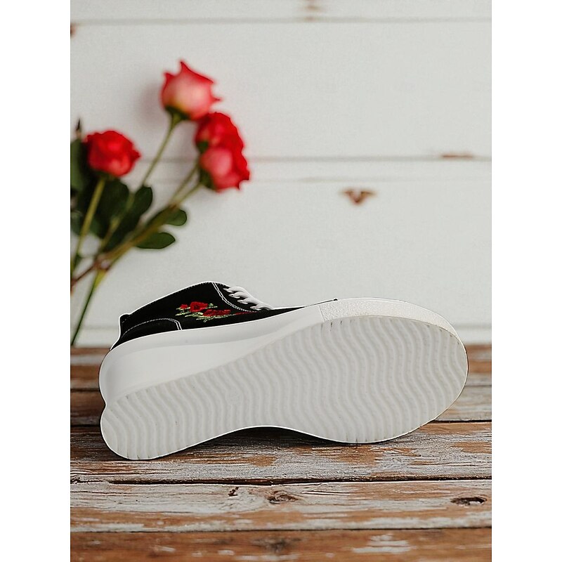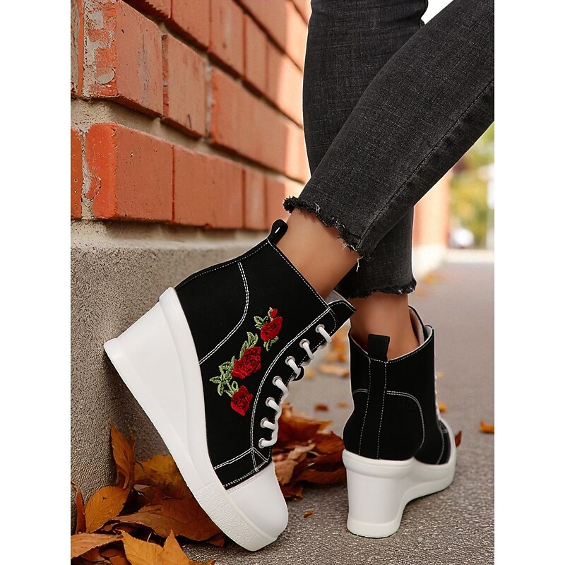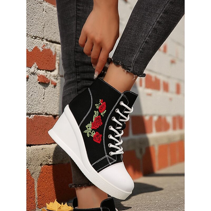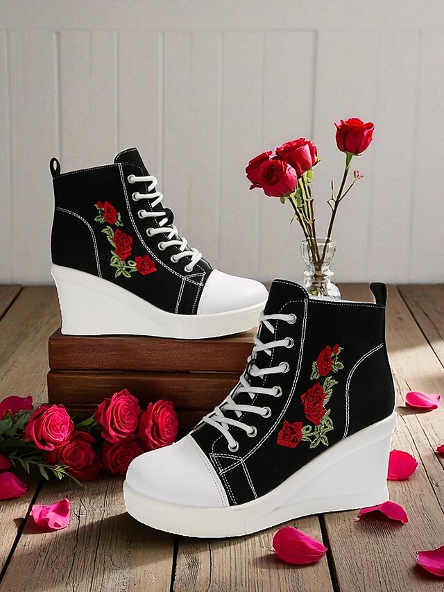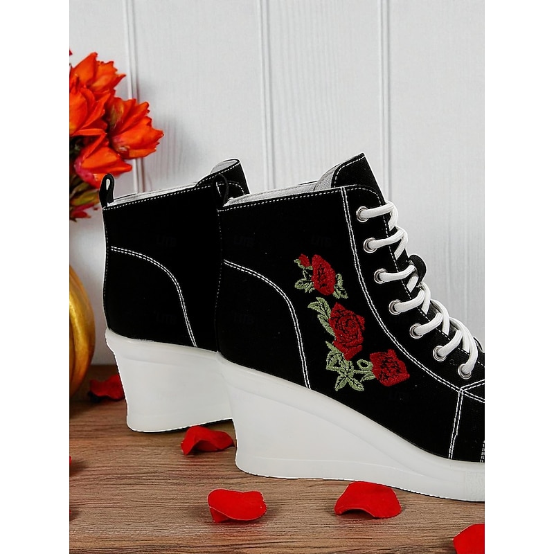 $34.99 - Women's Black Canvas Wedge Sneakers with Red Rose Embroidery, Lace-Up Platform Casual Shoes for Streetwear, Holloween Parties and Festivals 2025. Shop for cheap Shoes For Women online? Buy at lightinthebox.com on sale today!