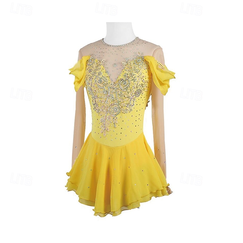 More information about Figure Skating Dress Women's Girls' Ice Skating Dress Yellow Patchwork Thumbhole Mesh Spandex Stretchy Training Practice Professional Skating Wear Thermal snug Crystal / Rhinestone Long Sleeve Ice