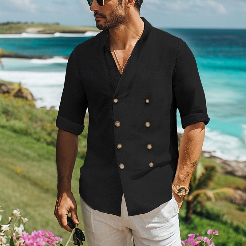 More information about Men's Shirt Linen Shirt Band Collar Shirt Summer Shirt Beach Wear Button Up Shirt Plain Vacation Curise Black White Blue Long Sleeve Band Collar Spring & Summer Clothing Apparel Double Breasted