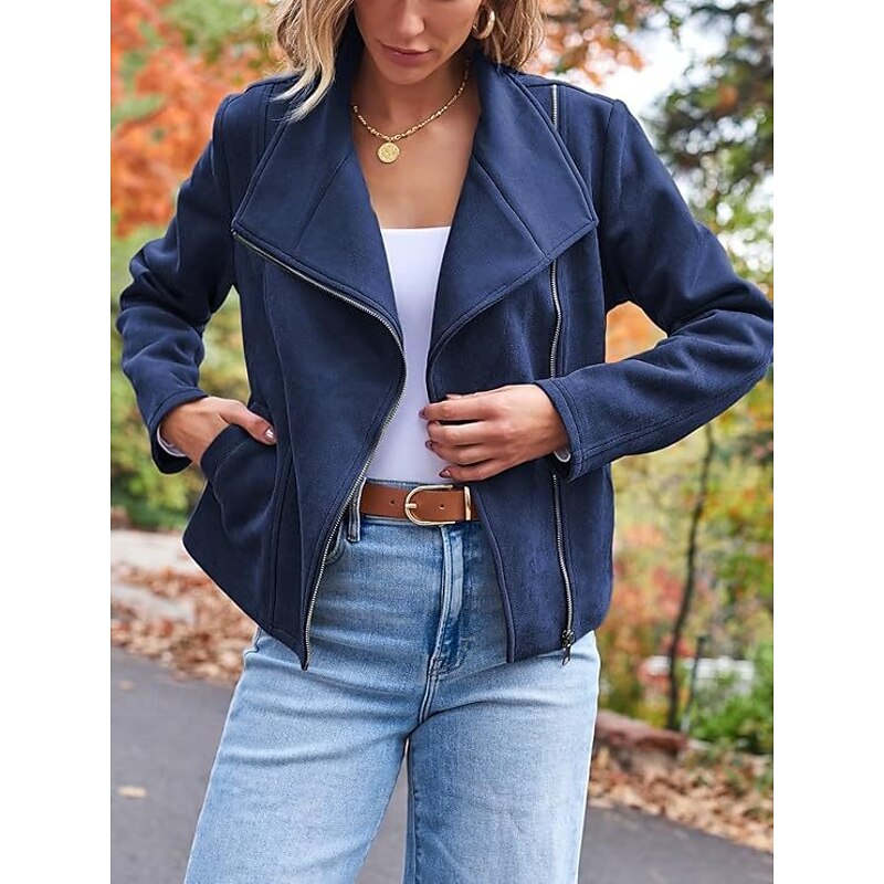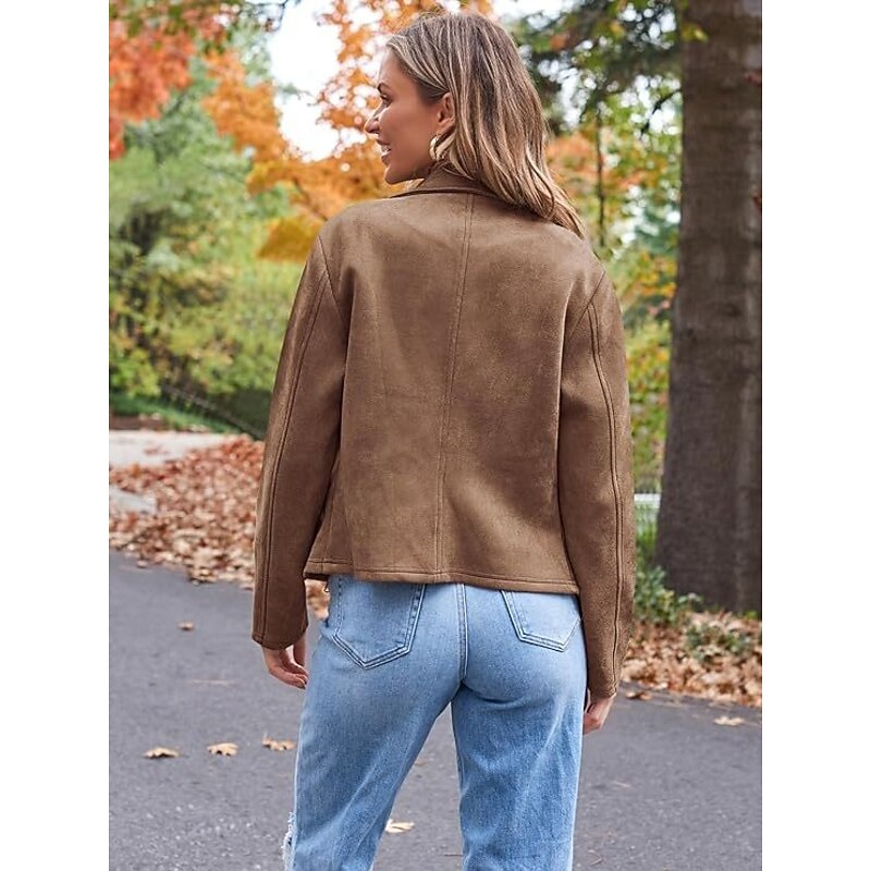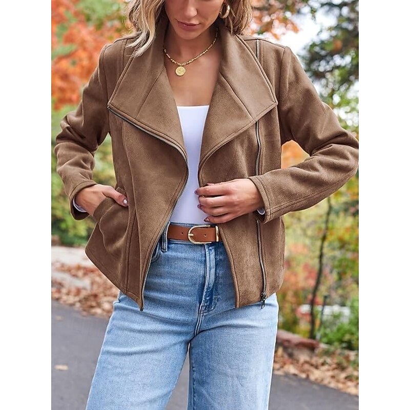 : The jacket boasts a contemporary asymmetrical front zipper and a wide lapel collar, adding an elegant touch to its overall style. Available in a sophisticated solid color palette, including shades like black, camel, and brown, it provides a versatile option for any wardrobe.