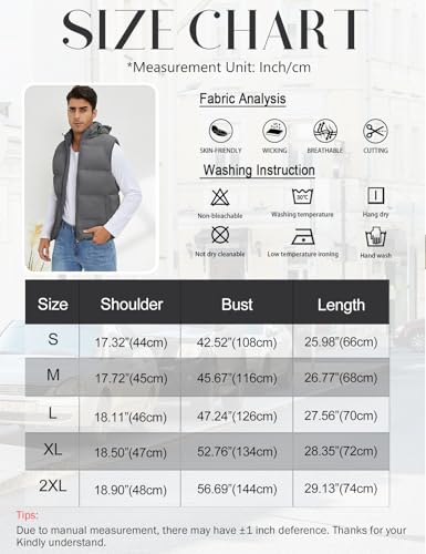 Fabric type: Fabric: 100% polyesterCare instructions: Machine WashOrigin: ImportedFabric: 100% polyester, our men's outerwear vests offer durability and flexibility. This fabric is known for its strength and resistance to shrinking, ensuring that your vest will last for seasons to come.Design: Men's winter puffer vests, solid color, standard length, full zipper closure, slightly springy bands on the cuffs and hem, two side pockets with zippers, detachable hood with adjustable drawstrings which providing added protection when needed, with its padded design, this vest provides extra cushioning for a cozy fit, ensuring enough comfort during chilly days.Occasion: Ideal for various occasions, this versatile vest can be worn for sports activities, casual outings, or even as part of a fashion-forward ensemble. Its sophisticated design and practical features, such as multiple pockets for storage, make it suitable for everyday wear or outdoor adventures during the winter season.Washing Tips: Machine washable, do not bleach, avoid washing with hot water.Size: All sizes are US sizes. Please order according to your daily shopping habits. Perfect for everyday use. superior materials and excellent craftsmanship ensure long-lasting durability.