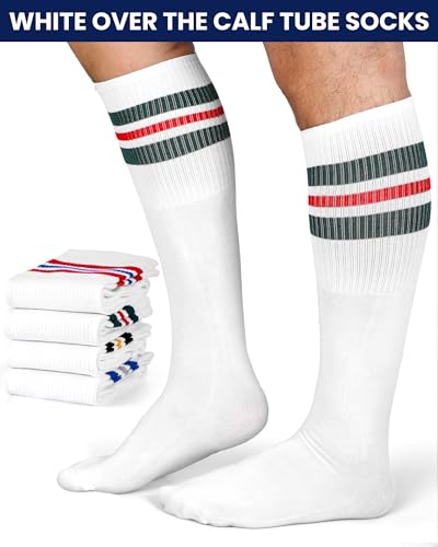 Fabric type: Pure cottonCare instructions: Machine WashOrigin: Imported4 Pairs Pack: this set contains 4 pairs of striped tube socks, one in each color, fit for everyday use or sharing with family or friends, they are a clever and practical method for your sock collection; These white tube socks provide a budget friendly way to stock up on your favoritesClassic Three Stripe Design: the classic three stripe design of these striped socks enhances the vintage vibe while adding an element of fun; This feature makes our white tube socks standout, bringing retro style to your wardrobeComfortable Materials: the 4 pairs striped tube socks are crafted with pure cotton, offering unparalleled comfort; Pleasant to touch and gentle on your skin, these socks give your feet a cozy feel throughout the daySizing for latest Men: worry about ill fitted socks no more; Our vintage striped socks come in size 10-13, fit for most adult males; The ideal fit ensures that they retain their shape even after multiple washes without compromising on comfortSuitable for Multiple Scenarios: these sports socks are fit for everyday wear and can be worn with any outfit; Whether you're wearing sneakers, shoes or boots, basic cotton blend socks are perfect for a casual and sporty look; Suitable for basketball and football; Lightweight, breathable sports socks can be worn all year round Perfect for everyday use. superior materials and excellent craftsmanship ensure long-lasting durability.