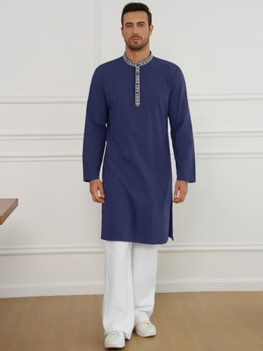 • Design Features: The Men's Cotton Kaftan features a vintage henley collar with exquisite embroidery and button closure. With long sleeves and side slits, it offers a new-age yet elegant touch, perfect for any occasion.